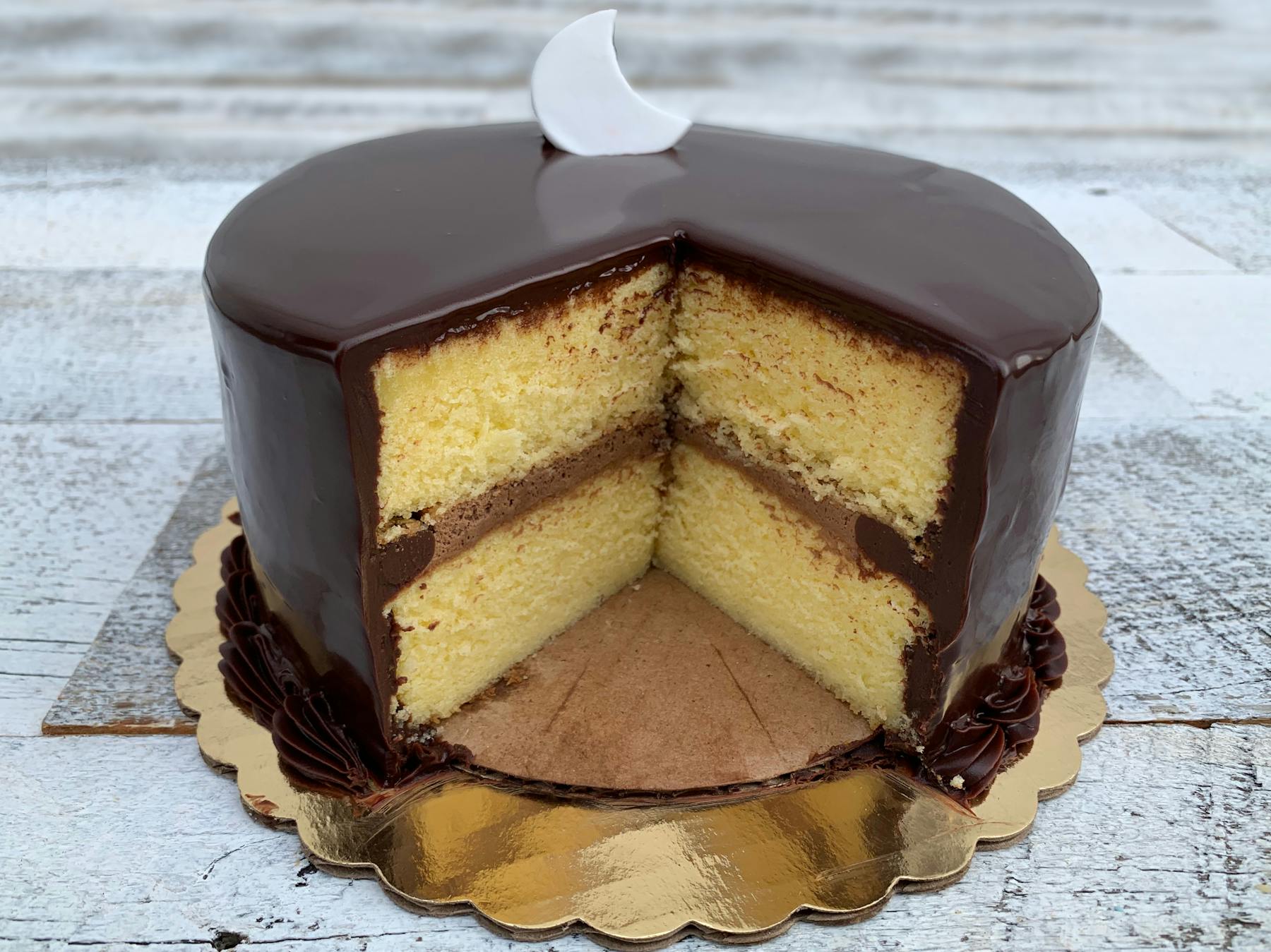 Half N Half Cake One Half Chocolate Cake Sandwiched With Chocolate Buttercream And Milk Chocolate Drip With Milk Chocolate Bark The Other Half A Milk Choc Chip Vanilla Sponge Sandwiched With White Chocolate Buttercream