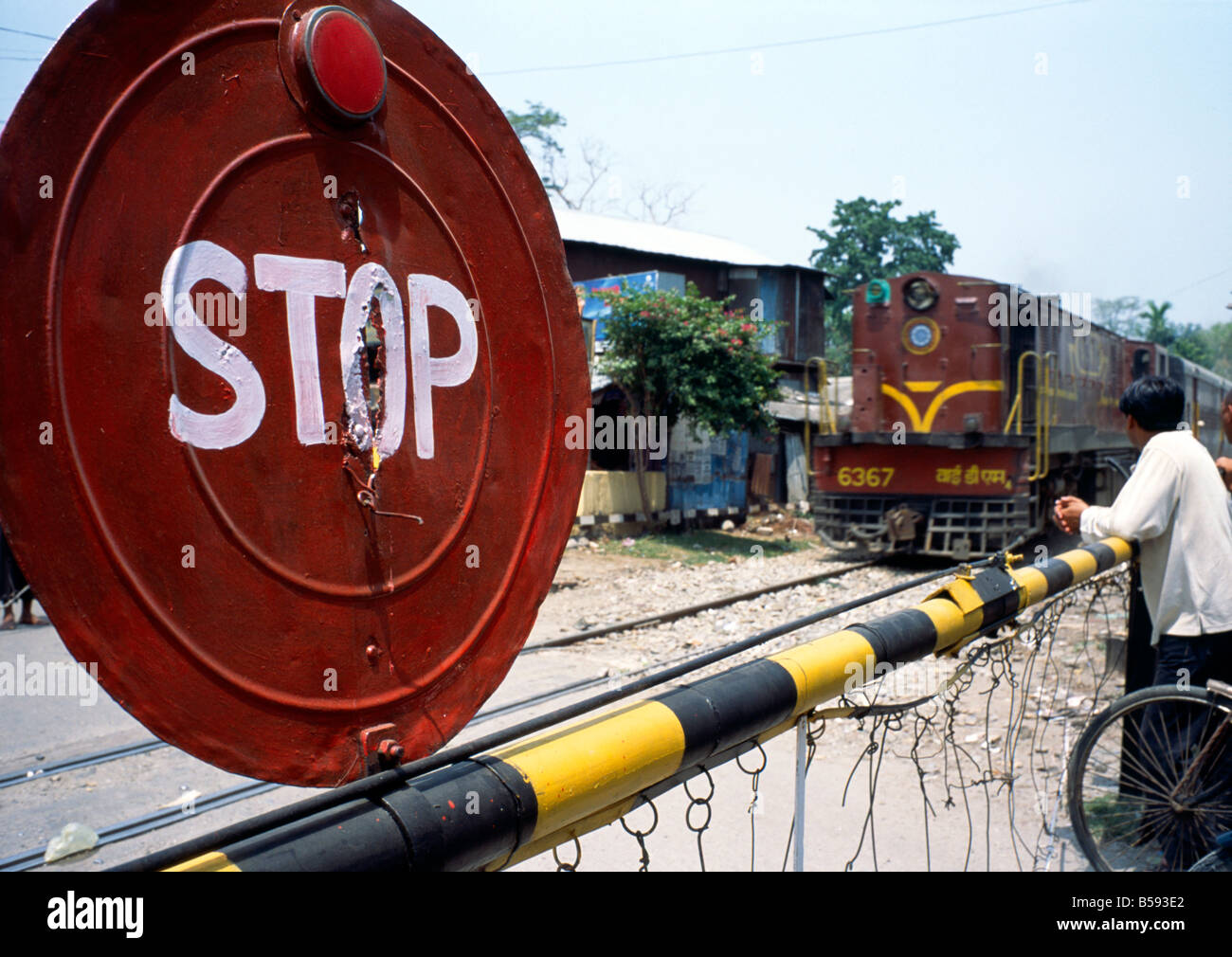 Stop Sign On An Indian Railway Level Crossing With A Train Going Stock Photo Alamy